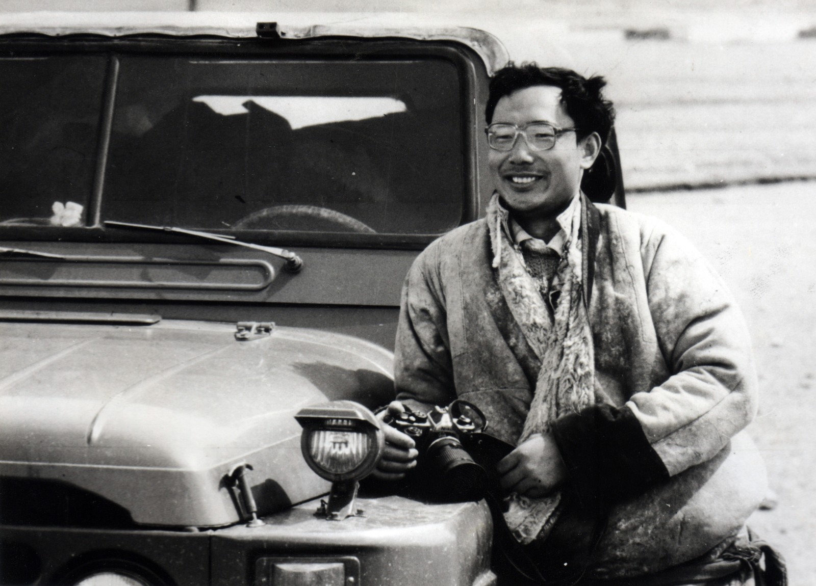 唐召明在藏北草原駕車採訪途中留影(覺果1991年攝)