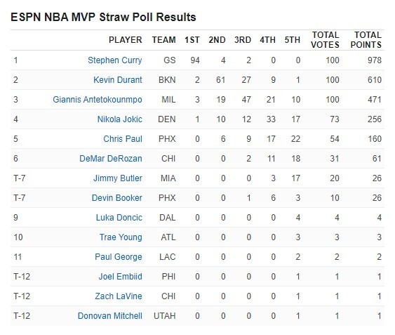 近日,著名媒体ESPN对本赛季的MVP进行了模拟投票,其中库里以978分排名第1,杜兰特以610分位列第2,接下来依次是字母哥471分,约基奇256分,保罗160分。而在官方公布的MVP榜中,库里和杜兰特也都一直霸占着前两名的位置。以目前来看,两人非常有希望竞争本赛季MVP。
