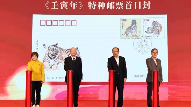 虎虎生威,寅年祥瑞。 1月5日,《壬寅年》特種郵票首發儀式在國家博物館隆重舉行。在《壬寅年》郵票揭幕之後,緊接著郵票首日封也撩開面紗。中華全國集郵聯合會第七屆理事會會長楊利民,清華大學美術學院院長、中國美術家協會副主席魯曉波,中國郵政集團有限公司副總經理康寧,滑雪世界冠軍郭丹丹共同為《壬寅年》首日封揭幕。