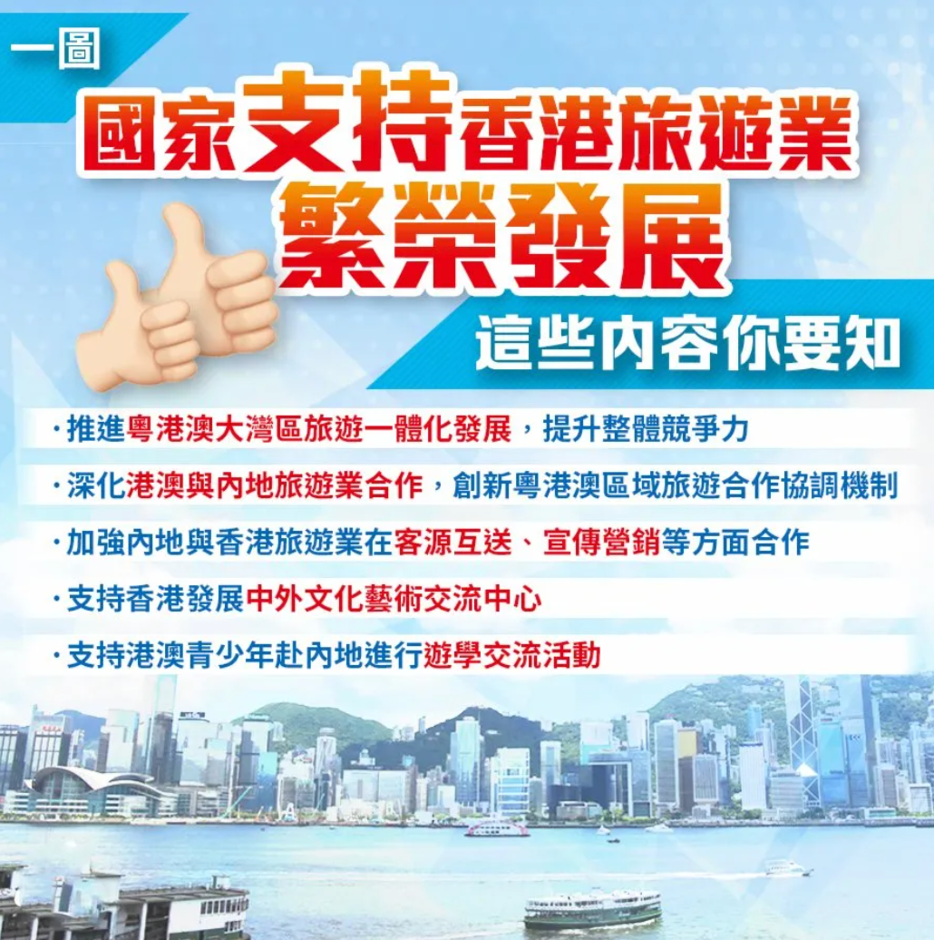 支持香港旅遊業繁榮發展,加強內地與香港旅遊業在客源互送、宣傳營銷等方面合作。