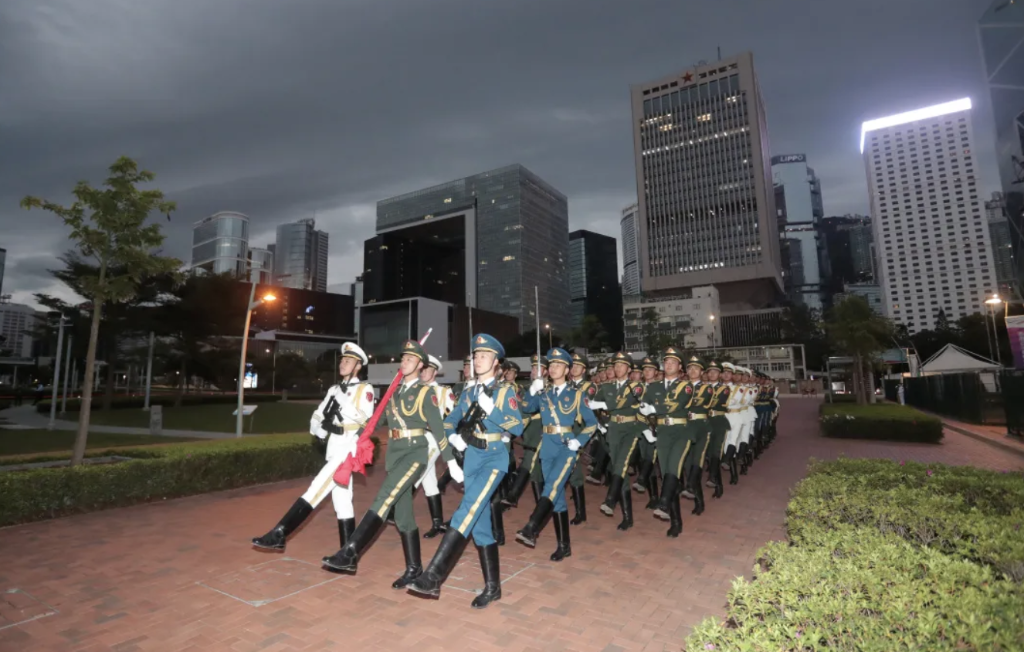 早上7時,駐香港部隊三軍儀仗隊護旗方隊從中環軍營出發,陸海空三軍近300名官兵在中區軍用碼頭整齊列隊,升國旗儀式正式開始。