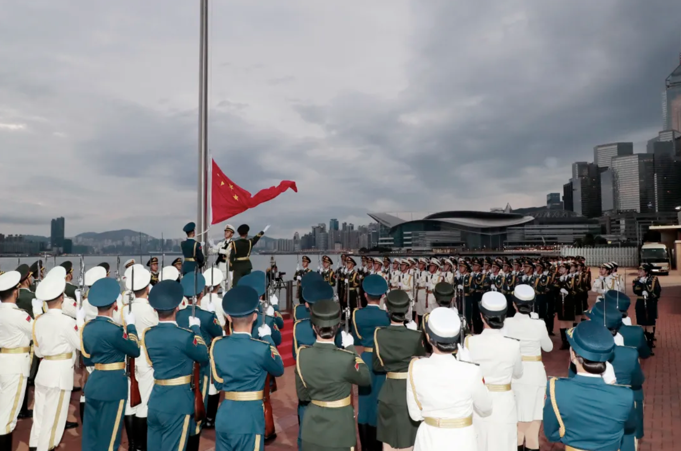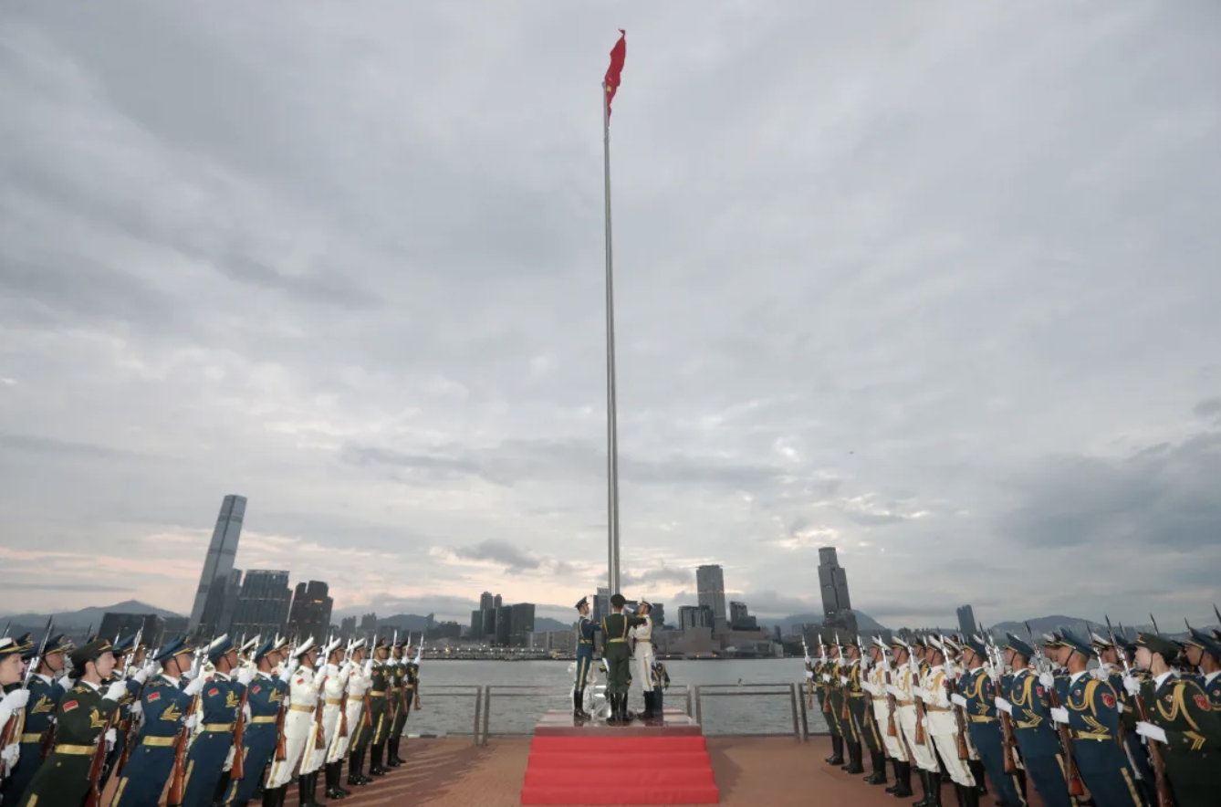 隨著雄壯的國歌聲響起,五星紅旗冉冉升起,駐香港部隊官兵面向國旗莊嚴敬禮。