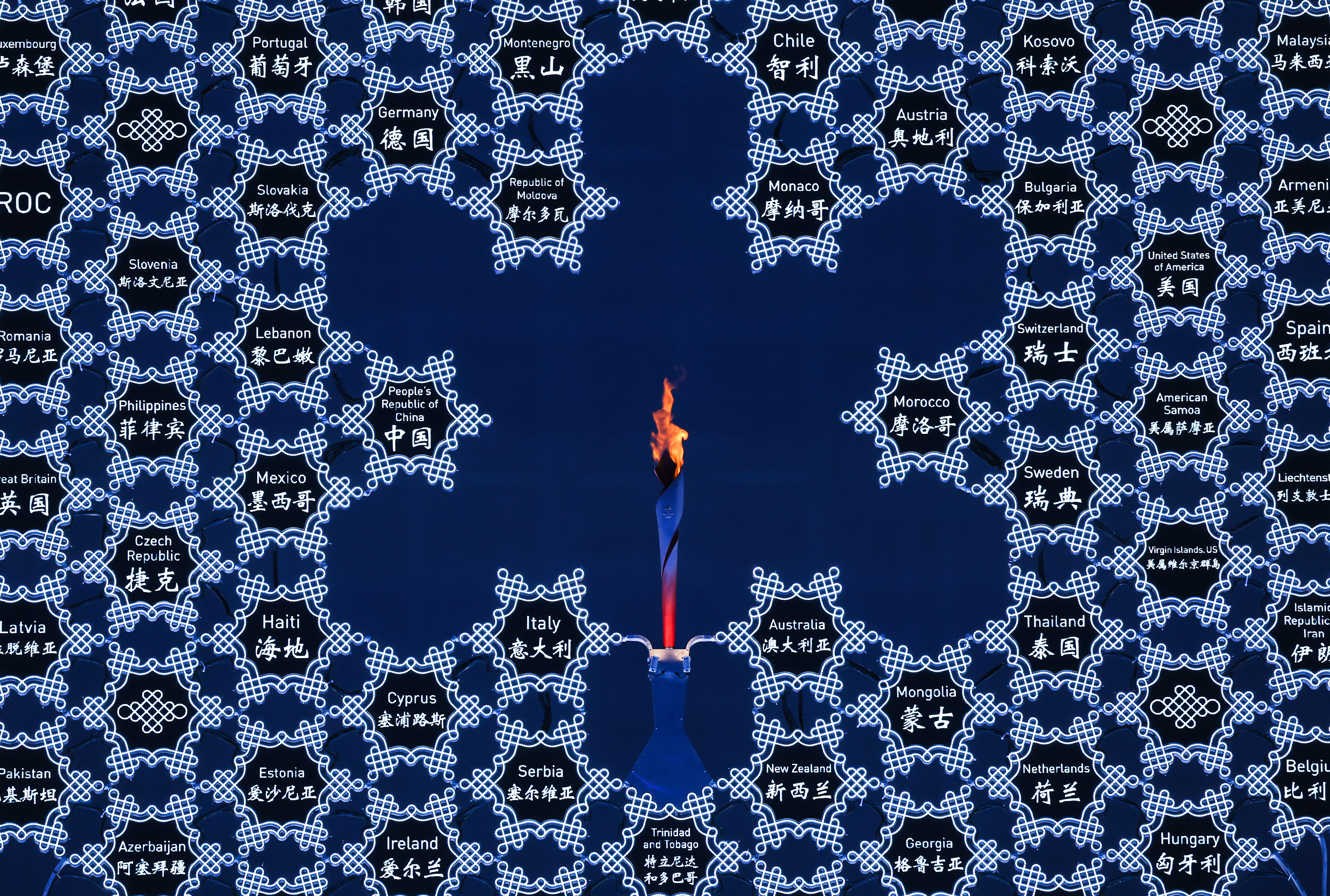 “屏幕中,AR(增強現實)雪花在地球的映襯下同步下落匯聚,象徵人類命運共同體的大雪花遨遊天際,最終飛回地屏中心。在萬衆矚目下,一個含有所有參賽國家和地區名稱、長約15米的雪花形火種裝置緩緩升起,浪漫純潔、熠熠生輝,閃耀‘鳥巢’中央、直擊觀衆內心,象徵全世界人民緊密團結在一起。”開幕式視效總監王志鷗闡釋道,“特別是在疫情下舉辦的本屆冬奧會,這朵雪花講述的不僅是‘我’的故事,更是‘我們’共同的未來,凸顯人類命運共同體的重要意義,昭示全世界必須團結互助,才能戰勝困難。”