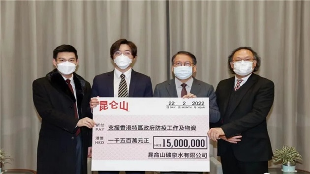 針對香港目前嚴峻的疫情形勢,昆侖山礦泉水有限公司股東譚錦球,迅速發動公司董事局全力支持,即時撥捐3000萬港幣支援全城防疫抗疫,其中,1500萬元將交由香港特區政府進行配對,以支援相應機構開展防疫工作,1000萬元捐予全港社區抗疫,500萬元捐予香港義工聯盟,助力全城抗疫工作。