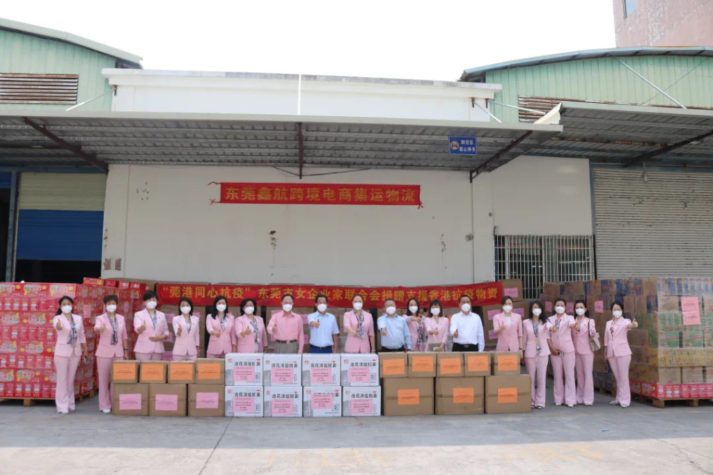 自香港第五波疫情發生以來,東莞市女企業家聯合會愛心女企業家積極捐款捐物,短短一天之內募集五十五萬元防疫物資(蓮花清瘟膠囊、專供香港V3D醫用口罩、淮山面、公仔面、免洗手消毒凝膠等)。