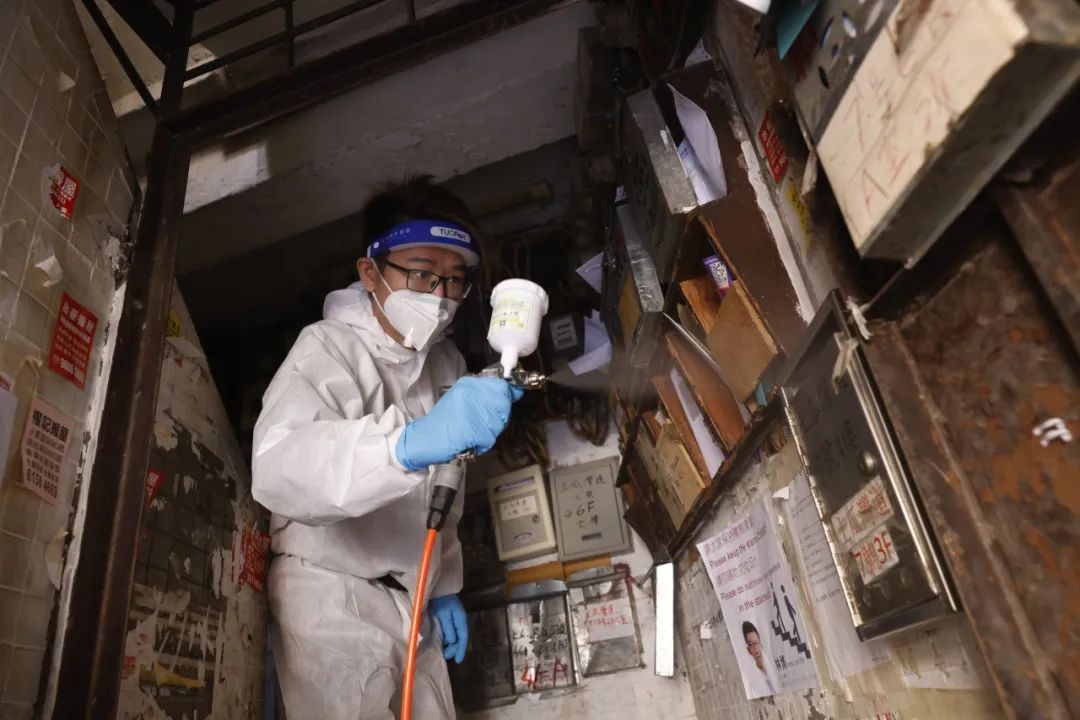 截至目前,已完成2083座舊樓宇消毒工作,佔全港的9.8%,惠及近13萬戶。