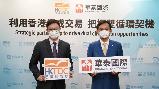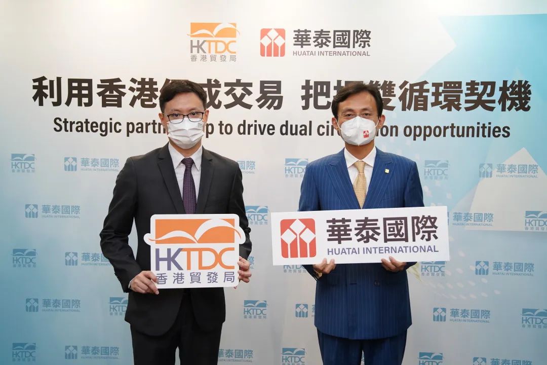 香港貿易發展局副總裁劉會平(左)與華泰金控首席執行官王磊(右)宣布成為戰略合作夥伴香港貿發局副總裁劉會平表示,香港除了是世界貿易樞紐,亦是國際金融中心,我們在促成投資項目方面的成功,展示了香港優秀的金融生態系統,能為內地及亞洲區內的機構提供多元化及優質的專業及金融服務,實現雙循環的目標。華泰證券是中國內地的頂尖證券商之一,華泰國際是華泰證券發展國際業務的重要平台,在企業金融方面擁有專業知識及精英團隊,因此是我們理想的合作夥伴,協助貿發局實現工作目標,在復雜的國際環境下,讓香港更好發揮其優勢及作用,為中國內地企業、香港及國際的機構、創新研究和項目持有人創造機遇。