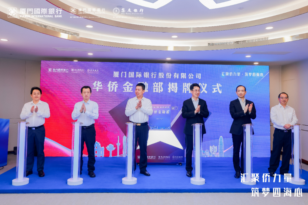 廈門國際銀行黨委書記、董事長王曉健致辭隨後,廈門國際銀行華僑金融品牌文宣視頻正式亮相,福建省委統戰部常務副部長、福建省僑辦主任黃進發,全國政協委員、中國僑聯副主席、福建省僑聯主席陳式海,全國政協委員、中國僑商會常務副會長、澳門歸僑總會會長劉雅煌,廈門市金融局局長朱慶華,人行廈門中心支行副行長賴永文以及廈門國際銀行黨委書記、董事長王曉健共同為華僑金融部揭牌。