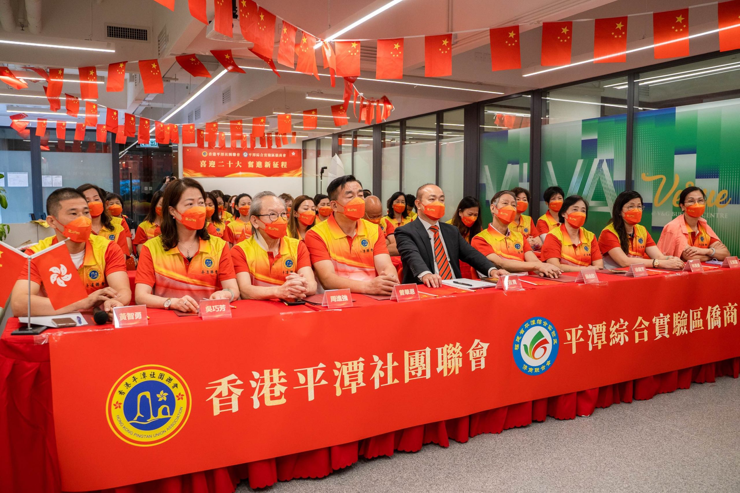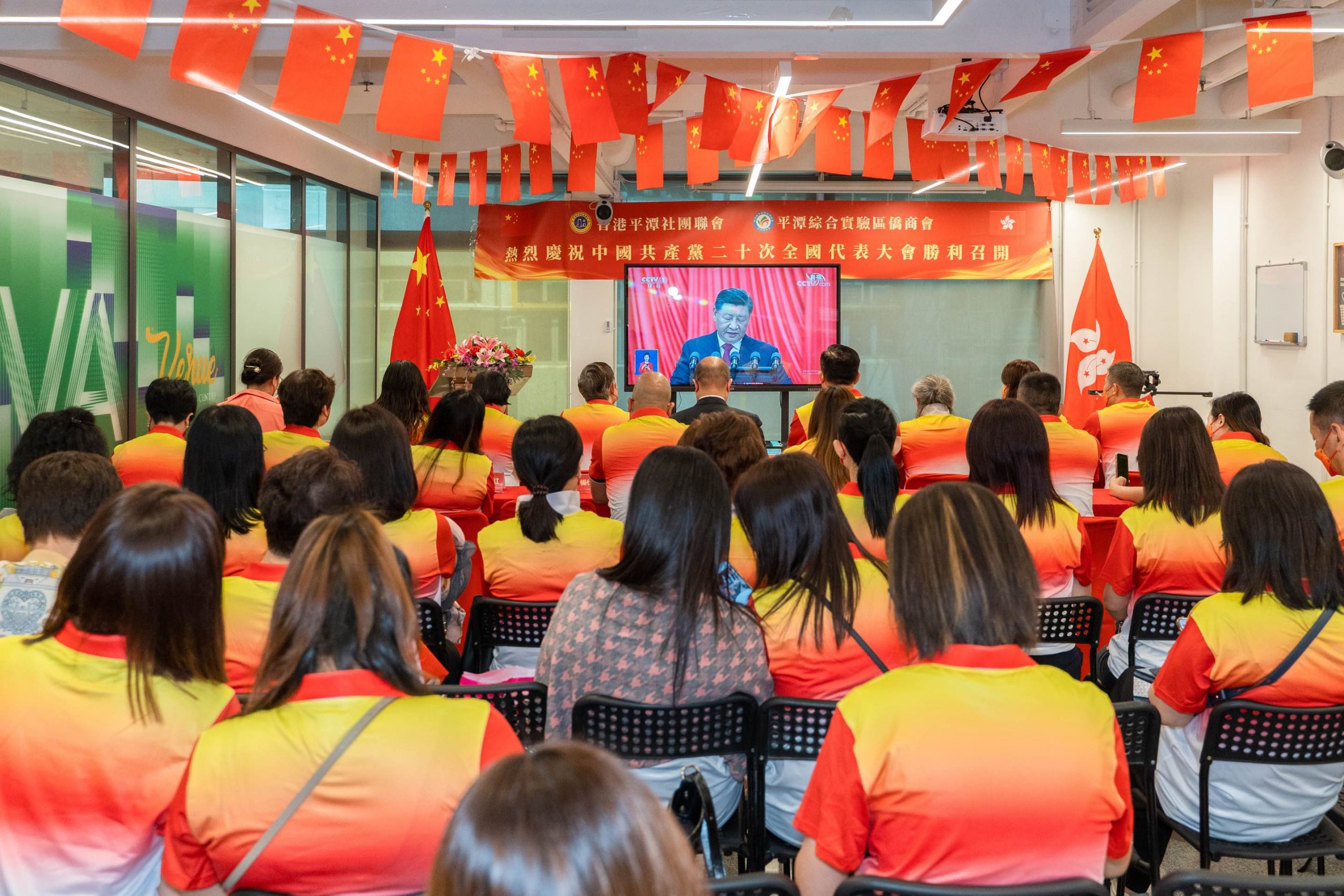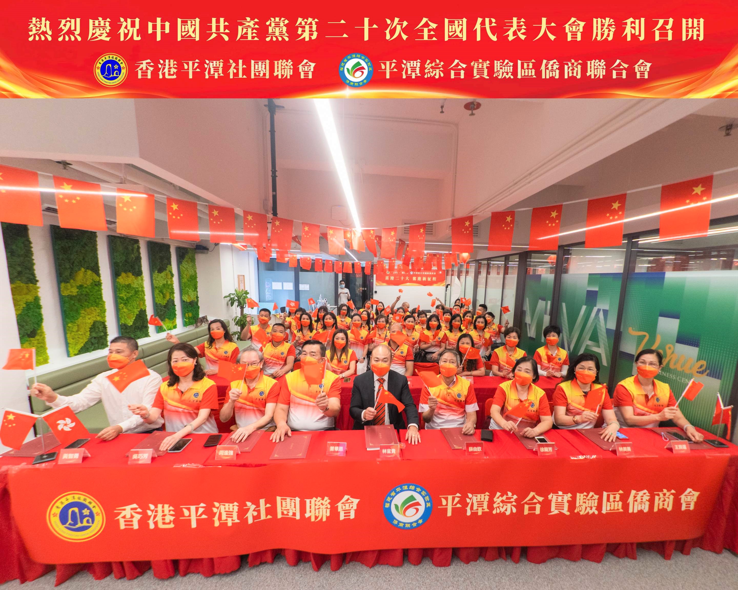香港平潭社團聯會主席林官貴,名譽主席徐蘭芳,周進強,常務副主席吳巧芳、曾華恩、名譽顧問兼九龍分會會長薛由欽,副主席兼婦女會會長林美美,副主席兼婦女會監事長王賢蓮、副主席黃智雲、林晉賢,新界分會監事長楊仕銀、秘書長林巧紅,九龍分會秘書長李小清,九龍分會常務副會長薛來森,婦女會榮譽會長林華玉、林梅雲、黃文青,婦女會常務副會長劉秀嵐,聯會青年工作部部長林宇鵬,會員發展部部長王成忠,會員福利部部長張向太,聯會副秘書長王增雲、林堅、林心芳及各分會副會長、鄉親會員代表等出席收看二十大開幕會直播。
