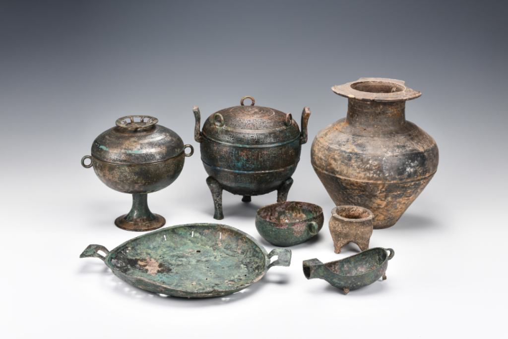 其中,兩座中型墓葬均為竪穴土坑墓,平面呈長方形,葬具均為一棺一槨。男性墓出土隨葬品36件(套),女性墓出土隨葬品10件(套),種類有青銅器、陶器、玉器、石器等。兩座墓中青銅器組合皆為鼎、豆、盤、舟、匜各一件。