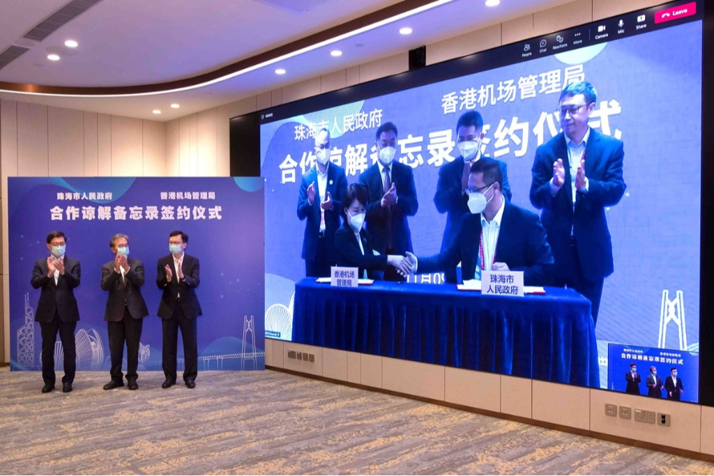 備忘錄由機管局機場運行執行總監張李佳蕙與珠海市副市長覃春在珠海簽署,珠海市市長黃志豪現場見證,運輸及物流局副局長廖振新、機管局主席蘇澤光和機管局行政總裁林天福則在港通過視像見證。