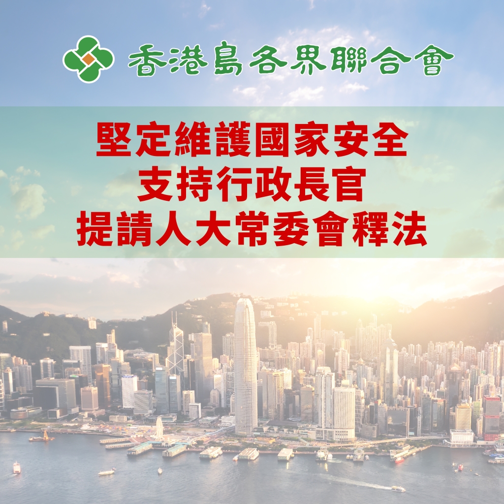 香港島各界聯合會堅定支持有關人大常委會就香港國安法釋法。是次釋法進一步完善香港特區維護國家安全的執行機制。透過釋法規範審理國安案件的司法程序,明確香港國安委的職責和權力,有利於維護行政主導,支持行政長官依法履職,形成香港特區維護國家安全的長效執行機制,對促進香港法治的發展具有重大長遠意義。