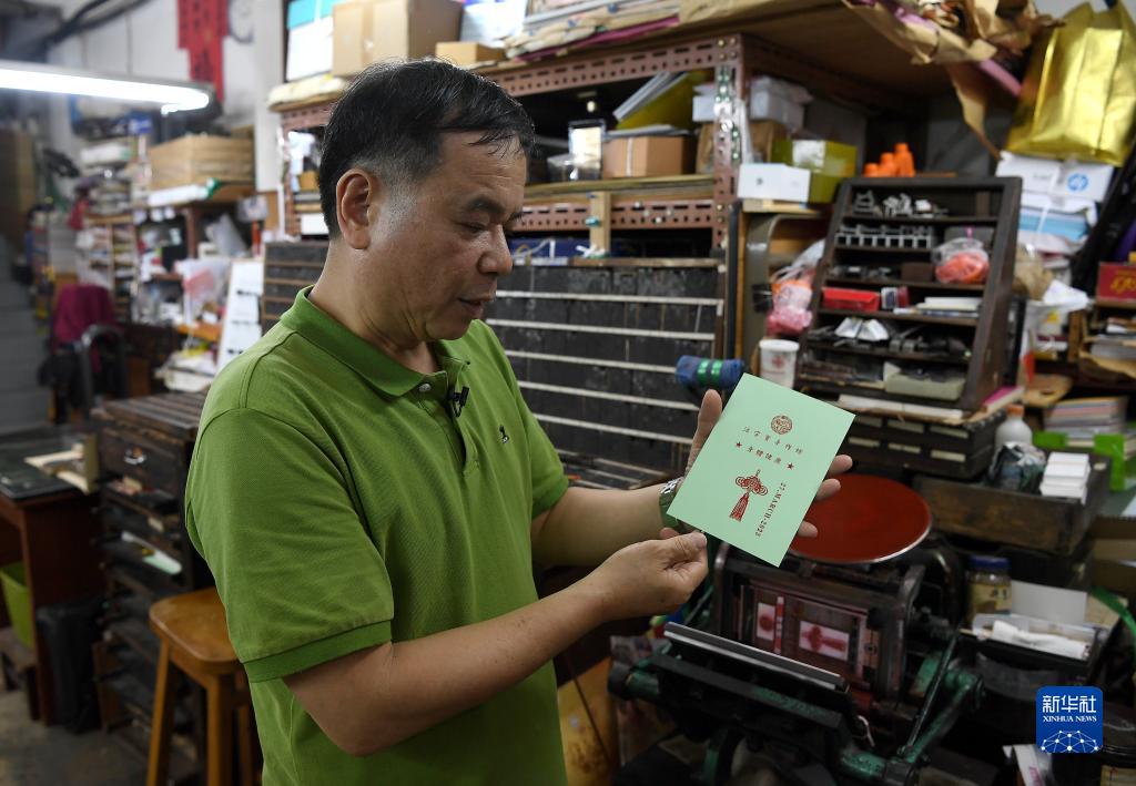 3月27日,任偉生展示用“手落照鏡”印刷機剛剛印好的卡片。新華社記者 陳鐸 攝在香港文物保護團體的協助下,任偉生用自己現成的店鋪和既有的活字印刷工具,成立了“活字寶手作坊”。