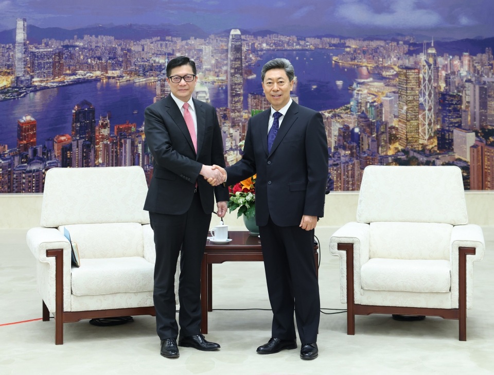 中共中央政治局委員、中央政法委書記陳文清昨日(25日)在京會見香港特別行政區政府保安局局長鄧炳強率領的香港紀律部隊文化交流團。