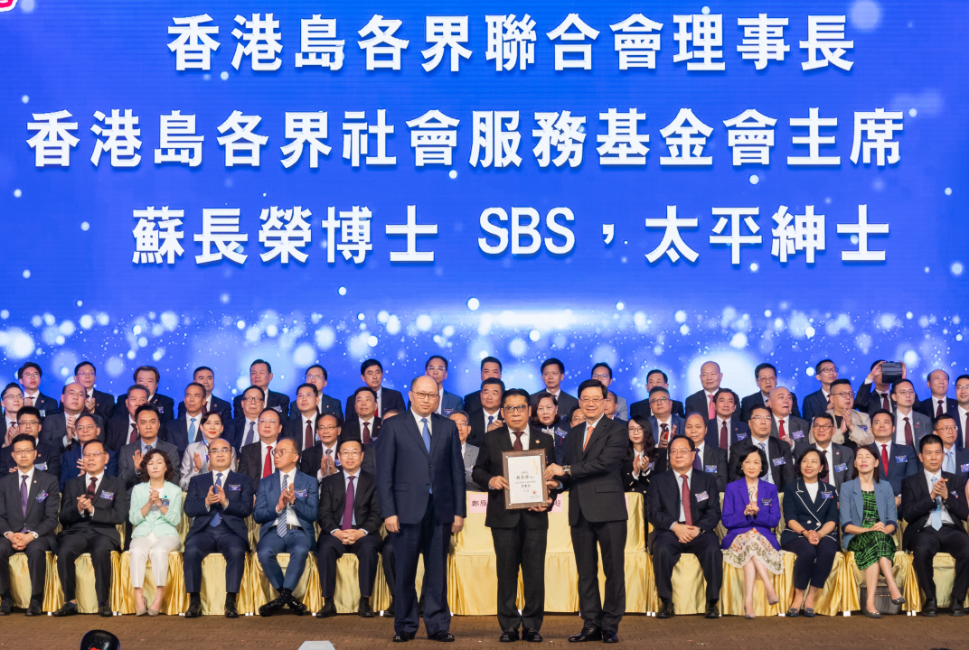 “香港島各界聯合會第十屆理事會暨香港島各界社會服務基金會第四屆董事會就職典禮”今日(6日)於香港會議展覽中心隆重舉行。特區行政長官李家超、中央政府駐港聯絡辦主任鄭雁雄、駐港國安公署副署長孫青野、外交部駐港特派員公署副特派員潘雲東、中央政府駐港聯絡辦副主任何靖、行政會議召集人葉劉淑儀、政制及內地事務局局長曾國衛、民政及青年事務局局長麥美娟、行政長官辦公室主任葉文娟、民政事務總署署長張趙凱渝等出席主禮。全場逾1500名社會各界人士,一同見證全國政協委員、立法會議員蘇長榮連任香港島各界聯合會理事長、香港島各界社會服務基金會主席,以及新一屆理事和董事就職。