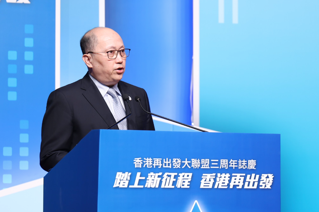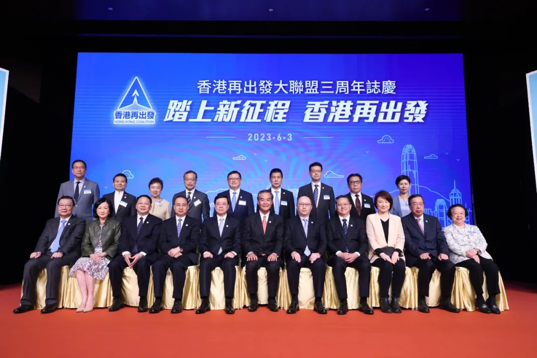6月3日,香港再出發大聯盟三周年誌慶“踏上新征程 香港再出發”酒會在香港會展中心舉行。全國政協副主席、香港再出發大聯盟總召集人梁振英,香港特區行政長官李家超,中央政府駐港聯絡辦主任鄭雁雄,香港再出發大聯盟秘書長譚耀宗等出席並致辭。