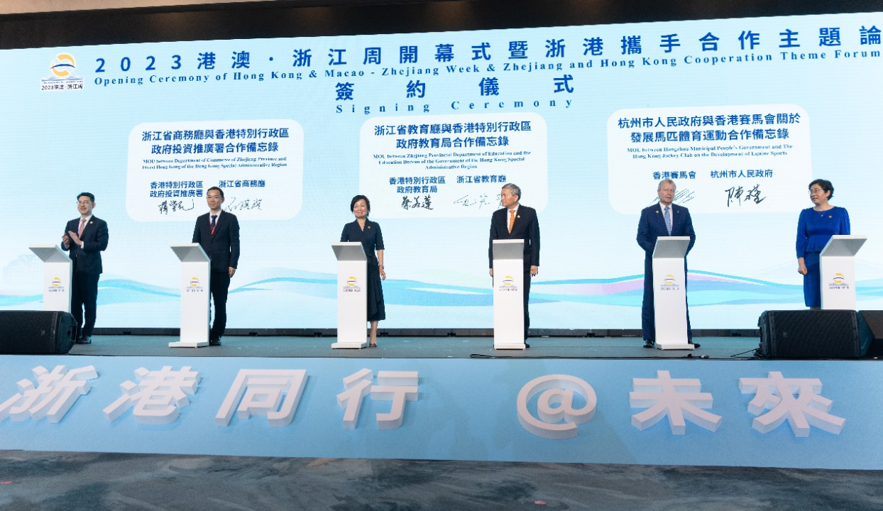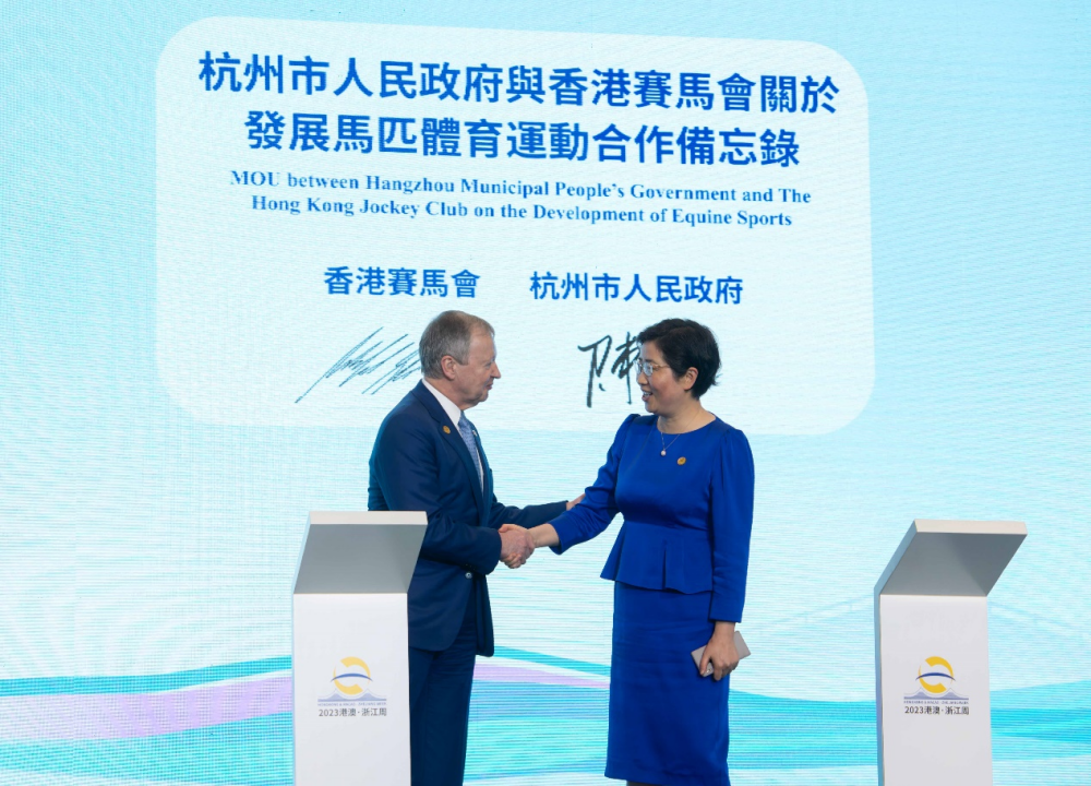 香港賽馬會(“馬會”)6月26日與杭州市人民政府在香港簽署合作備忘錄,以進一步加強杭州與香港的合作,共同推動國家馬匹體育運動發展。合作備忘錄的簽署儀式在“2023港澳∙浙江周開幕式暨浙港攜手合作主題論壇”中進行,並在香港特別行政區行政長官李家超及浙江省省委書記易煉紅的共同見證下,由杭州市政府常務副市長陳瑾與馬會行政總裁應家柏代表雙方簽署有關文件。