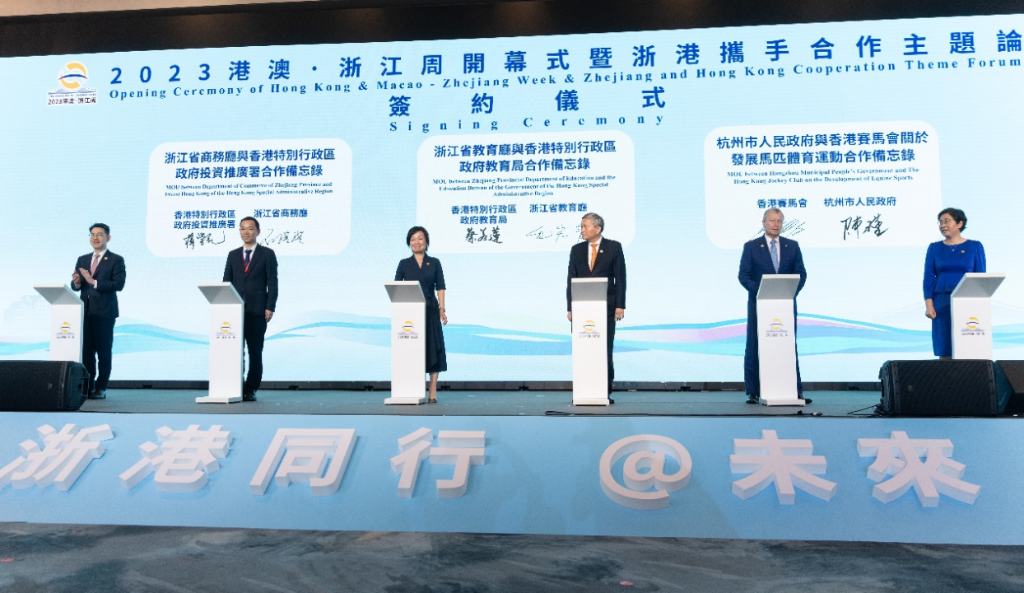 浙港在“2023港澳∙浙江周開幕式暨浙港攜手合作主題論壇”上簽署多份合作備忘錄,包括馬會行政總裁應家柏(右二) 與杭州市政府常務副市長陳瑾(右一)簽署共同推進馬匹體育運動發展的合作文件。農業農村部與國家體育總局於2020年9月發布《全國馬產業發展規劃(2020-2025)》,重點勾畫大力發展和推廣馬匹運動的藍圖,並把長三角地區納入發展區域之一,利用區域優勢發掘馬術運動消費潛能及提升其經濟效益。杭州作為長三角中心城市之一,正以舉辦亞運會為契機,全力培育體育產業,致力建成全國重要的體育產業示範基地和體育消費示範城市。馬會長期為內地的馬匹運動及相關產業發展作出貢獻,輔助國家推動落實《全國馬產業發展規劃》的目標。早在本年5月,馬會與 2022年第19屆亞運會組委會(亞組委)簽署合作備忘錄,為杭州亞運會馬術項目提供技術支援,奠定了杭州市政府與馬會在探索馬匹運動合作的堅實基礎和優良平台,藉此共同探討提升及推廣區內馬匹體育運動。