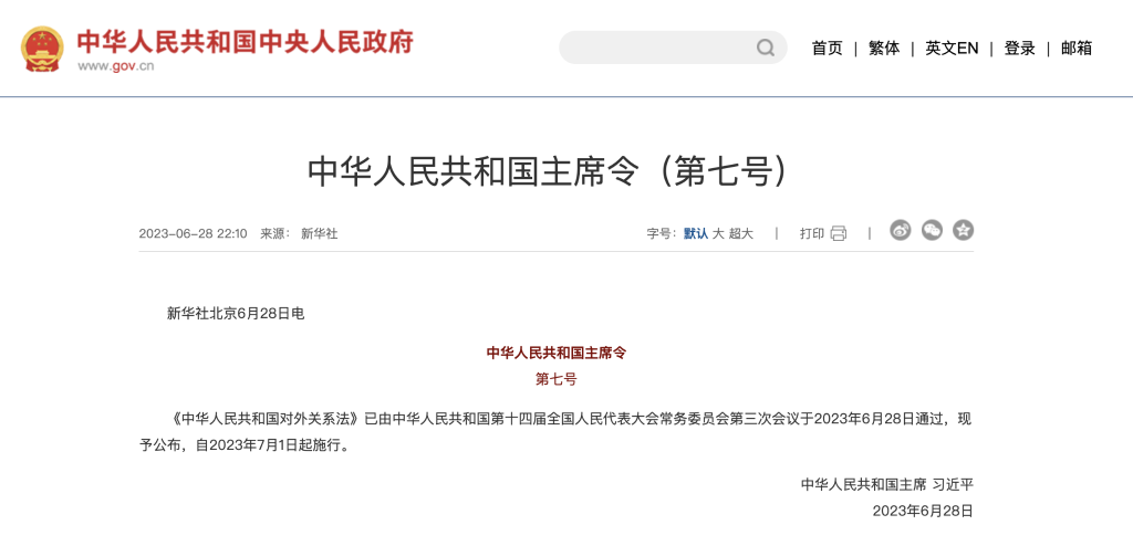 《中華人民共和國對外關係法》已由中華人民共和國第十四屆全國人民代表大會常務委員會第三次會議於2023年6月28日通過,現予公布,自2023年7月1日起施行。