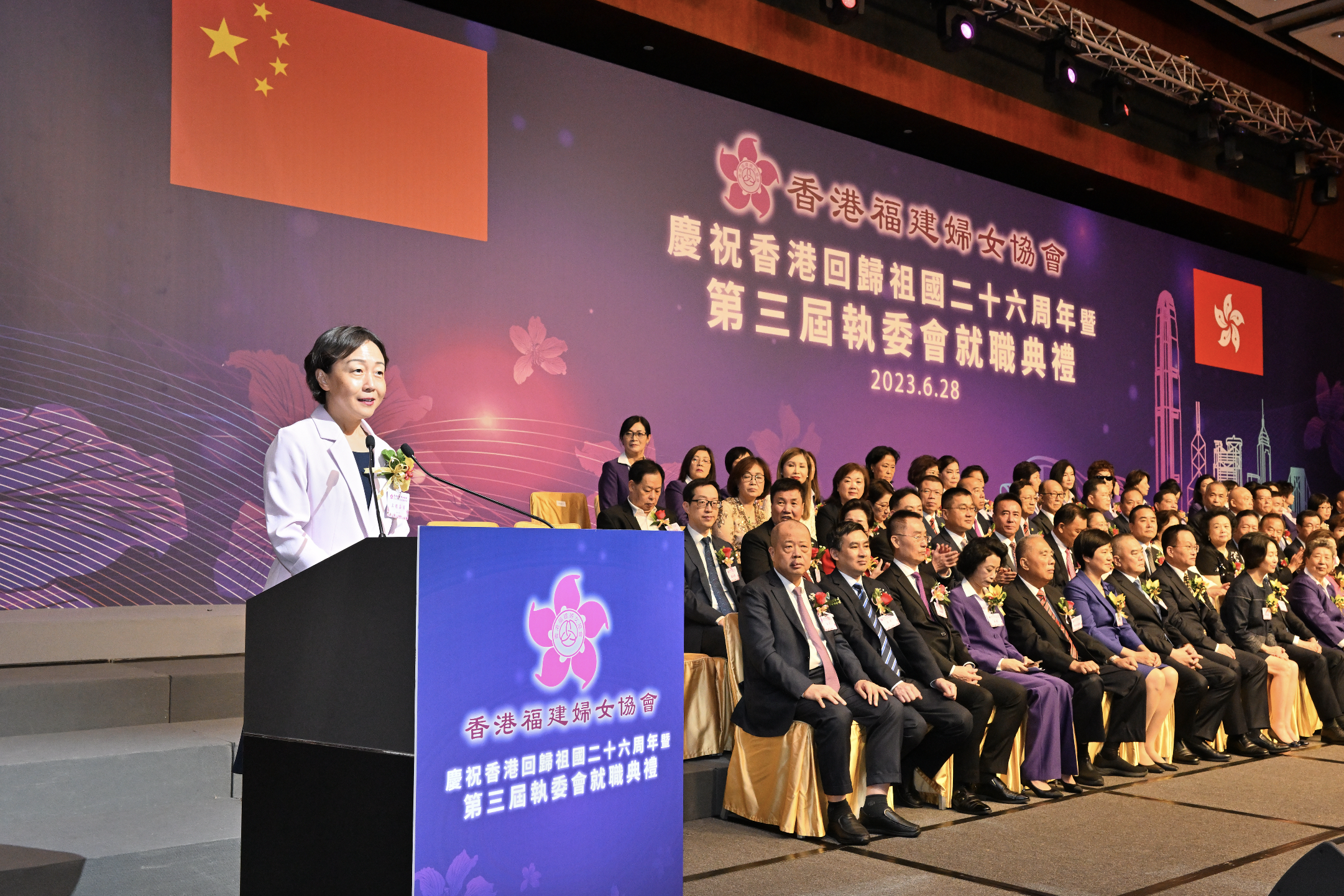 香港福建婦女協會舉行慶祝香港回歸祖國26周年暨第三屆執委會就職禮,現場舉行向香港福建婦協首屆青年委員會授旗儀式中央統戰部副部長、中華海外聯誼會副會長林銳,中央政府駐香港特別行政區聯絡辦公室副主任何靖,福建省委常委、常務副省長郭寧寧,中央駐港維護國家安全公署副署長李江舟等應邀擔任主禮嘉賓。