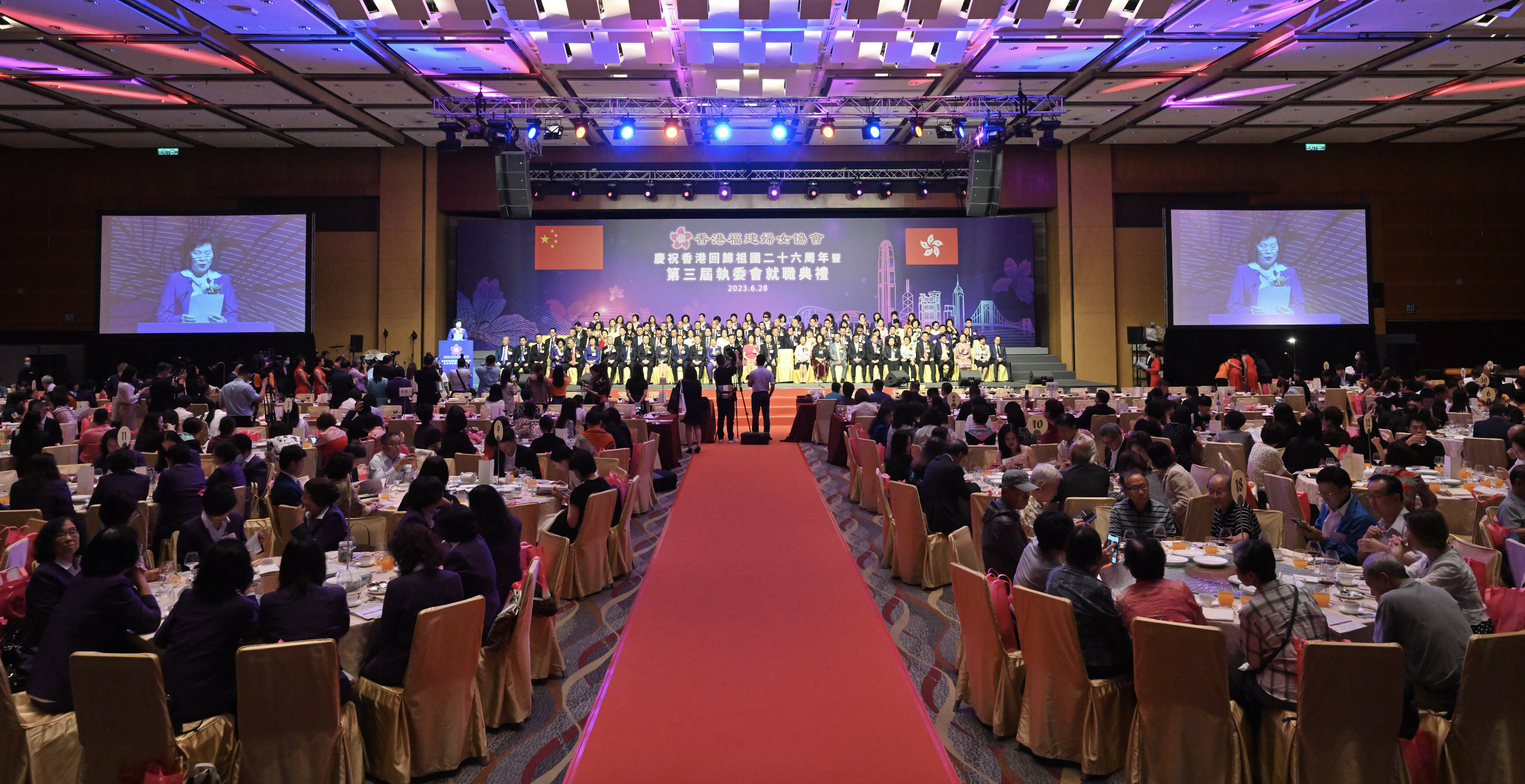 香港福建婦女協會榮譽顧問、永遠名譽主席黃周娟娟,永遠榮譽主席蔡黃玲玲,創會主席陳聰聰,主席涂雅雅,執行副主席李然等陪同主禮嘉賓進場,與社會各界賢達、婦協婦女姐妹歡聚一堂,慶祝香港回歸祖國26周年,祝賀婦協新一屆執委就職。