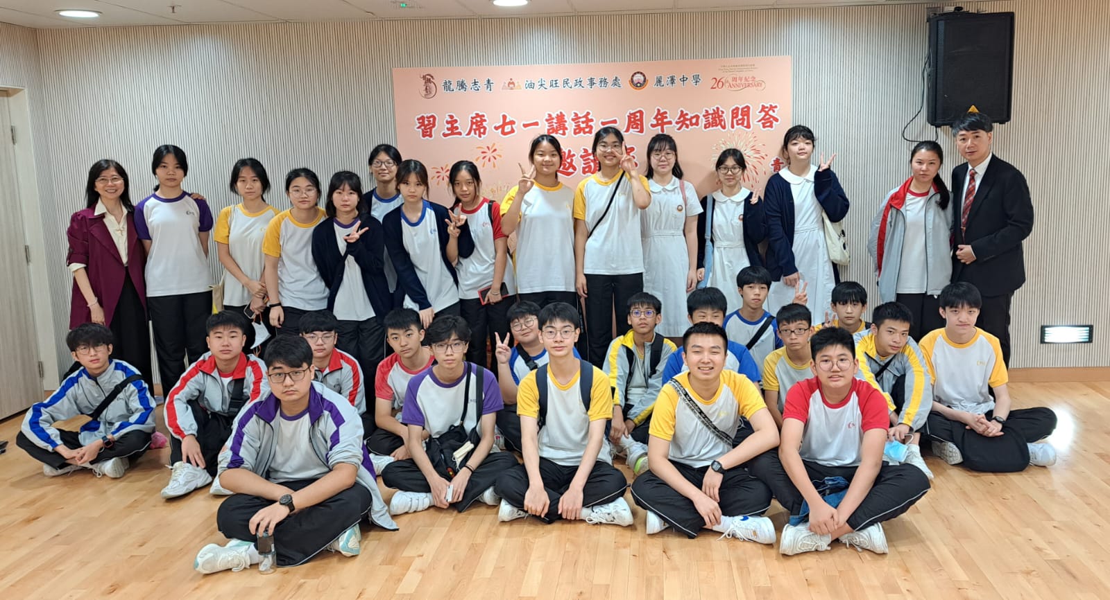 李潔明校長表示,感謝龍騰志青和油尖旺民政事務處,讓同學在慶祝香港回歸祖國26周年的日子,藉着問答比賽,重溫習近平主席七一重要講話,也是讓同學有機會深入了解香港在祖國全面發展的大局當中的意義。同時也配合教育局上月有關 “認識國家主席習近平的 ‘七一重要講話’ ”的簡報,加深同學認識 “一國兩制” 成功實踐對國家和香港發展的重要性,以及建立家國情懷,提升民身分認同。相信在多重進路的方式,有助國情教育的全面推展。