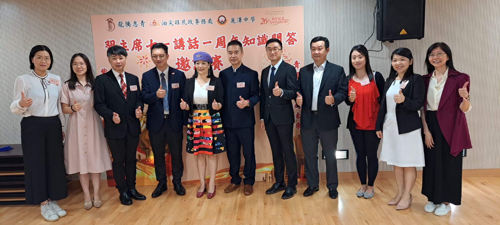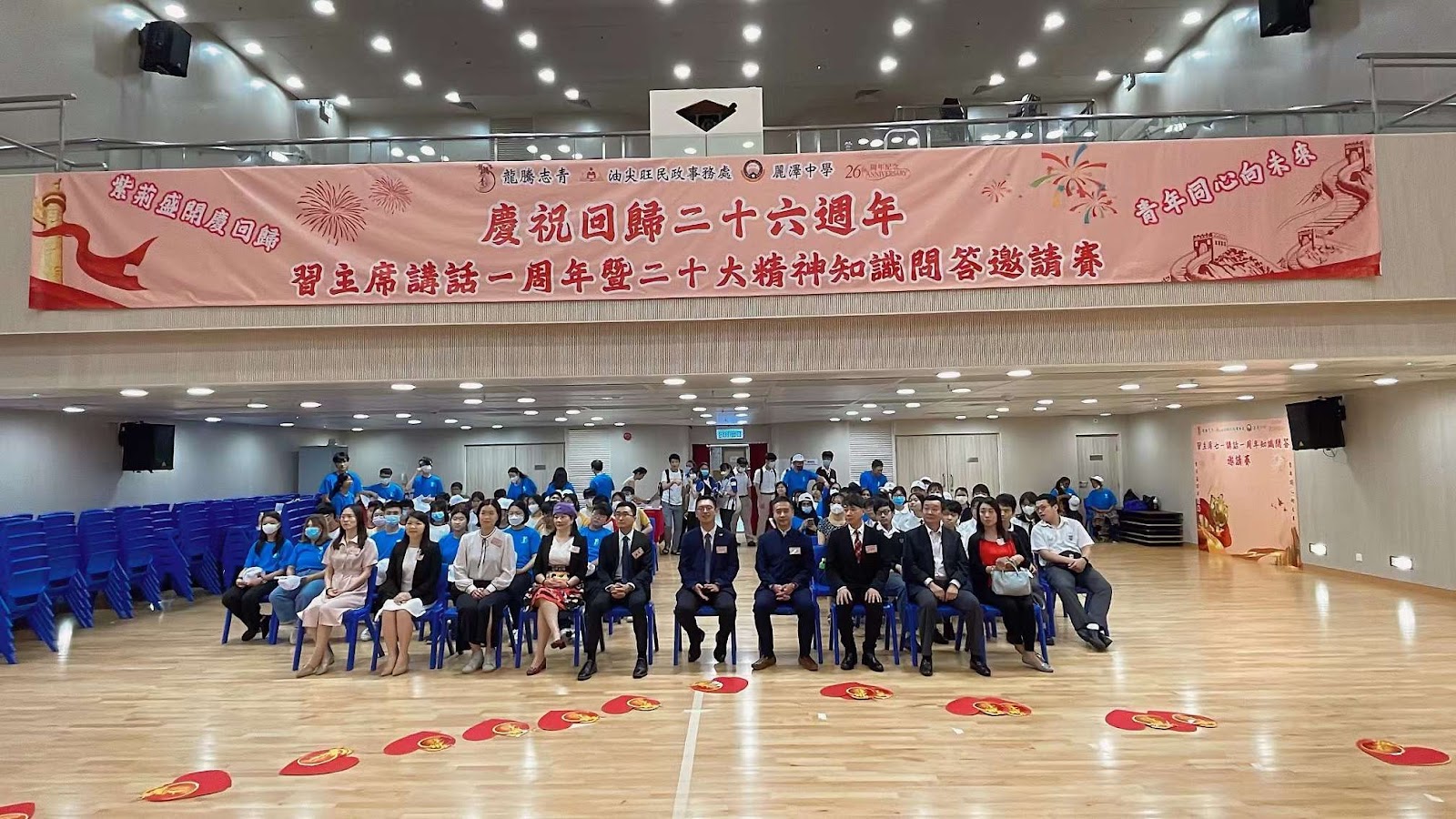7月5日,由麗澤中學、龍騰志青及油尖旺民政事務處於梁顯利油麻地社區中心舉辦習主席講話一周年暨二十大精神“紫荊盛開慶回歸 青年同心向未來”知識邀請賽。勞工及福利局何啟明副局長、油尖旺民政事務處余健強專員、龍騰志青汪紅會長、龍騰志青黎志樑榮譽顧問、中聯辦九龍工作部人事處鍾華副處長、麗澤中學李潔明校長等嘉賓出席主禮,5間中學約多100名學生及少數族裔青年參與。一眾青年砌出愛心圍繞26的數字,同心共慶回歸並高唱國歌。其後進行習主席七一講話一周年及二十大精神知識問答邀請賽,讓同學們從比賽中學習領悟習主席講話精神,以學鑄魂,以學增智,比賽分三個環節,必答題、挑戰題、搶答題,更有影視作品的題目,最後由麗澤中學參賽同學領先,穩奪冠軍。