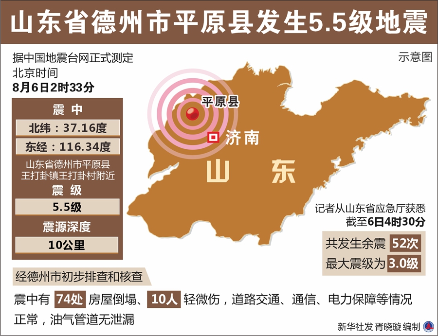 據中國地震台網正式測定,8月6日2時33分在山東省德州市平原縣(北緯37.16度,東經116.34度)發生5.5級地震,震源深度10公里。震中位於平原縣王打卦鎮王打卦村附近。