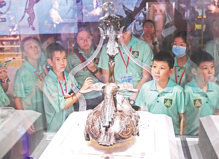 9歲的謝曜宇是香港青少年軍中年齡最小的團員之一,他充滿好奇地注視着這些精美的漆器,眼神中閃爍着對歷史的嚮往。“太精美了!沒想到那時工藝就這麼精緻!”謝曜宇忍不住舉起手機,用鏡頭記錄文物之美。