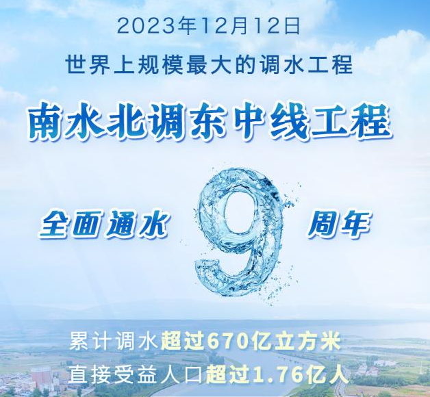 2023年12月12日,南水北調東中線工程全面通水9周年。該工程累計調水超過670億立方米,惠及沿線44座大中城市,直接受益人口超過1.76億人。
