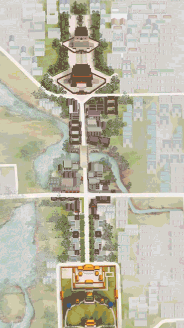 全長7.8公里的北京中軸線北端為鍾鼓樓,向南經過萬寧橋、景山、故宮、端門、天安門、外金水橋、天安門廣場及建築群、正陽門、中軸線南段道路遺存,至南端永定門;太廟和社稷壇、天壇和先農壇東西對稱布局於兩側。