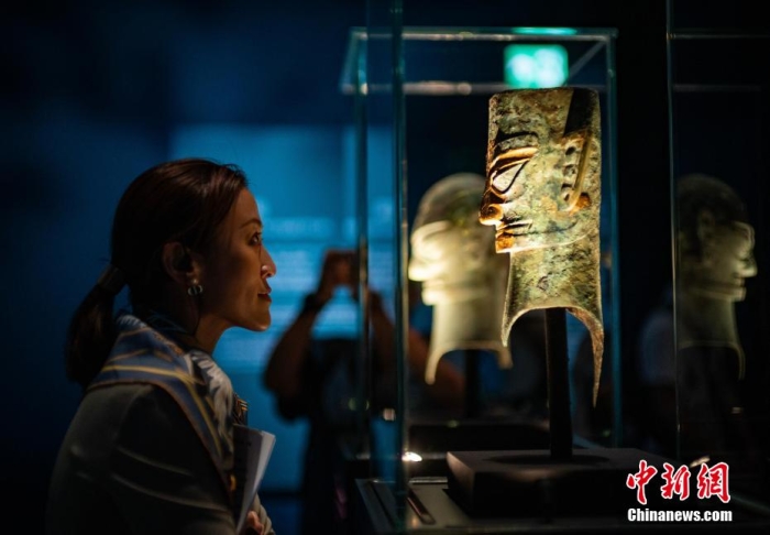 圖為一位女士駐足凝視三星堆代表性文物之一的“戴金面罩人頭像”。中新網記者 侯宇 攝不僅是演出“上新”,香港故宮文化博物館也陸續推出特別展覽,例如“凝視三星堆”特別展覽、多批故宮博物院珍寶等,吸引大批市民、遊客前來“打卡”。