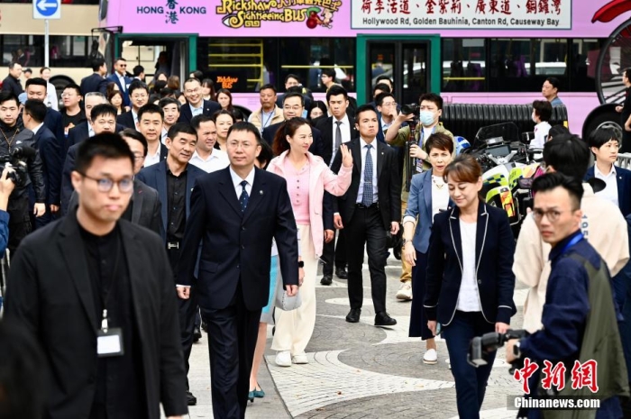圖為國家載人航天工程代表團在尖沙咀向市民揮手致意。中新網記者 李志華 攝2023年11月,國家載人航天工程代表團赴香港訪問,執行中國空間站建造任務的多名航天員在香港與大中小學生座談,與科技及高等教育界交流,參加全港各界的大匯演,出席中國載人航天工程展,掀起了香港的航天熱潮。