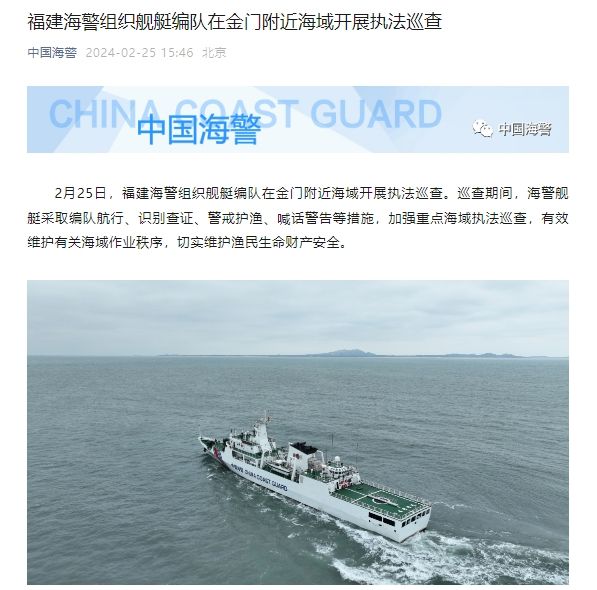 2月25日,福建海警組織艦艇編隊在金門附近海域開展執法巡查。巡查期間,海警艦艇採取編隊航行、識別查證、警戒護漁、喊話警告等措施,加強重點海域執法巡查,有效維護有關海域作業秩序,切實維護漁民生命財產安全。