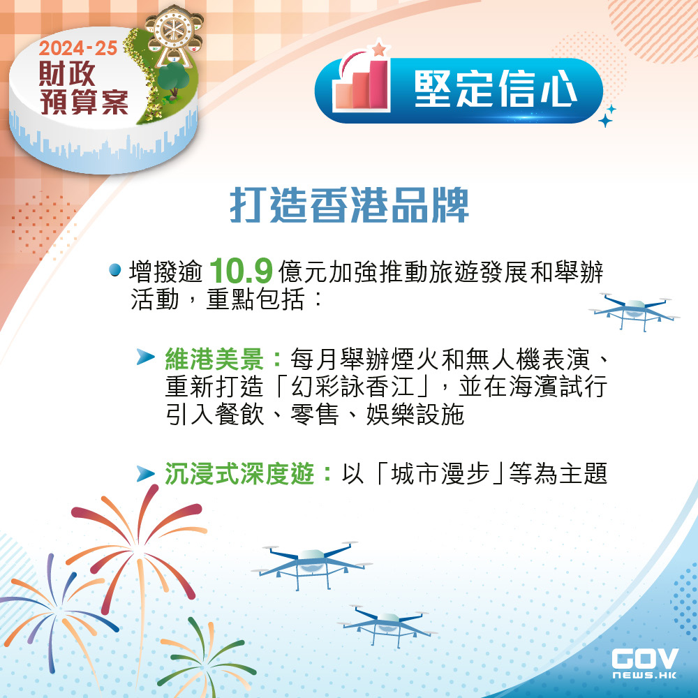 財政司司長陳茂波今日(28日)在立法會發表財政預算案,表示今年上半年會有80多項不同主題及類型的盛事。旅發局將以美麗的維港夜空為背景,每月舉辦煙火和無人機表演,並會重新打造“幻彩詠香江”燈光音樂匯演。發展局亦將會在維港海濱選擇合適地點,以試點方式引入餐飲、零售及娛樂等商業設施,為遊人帶來方便及更好體驗。