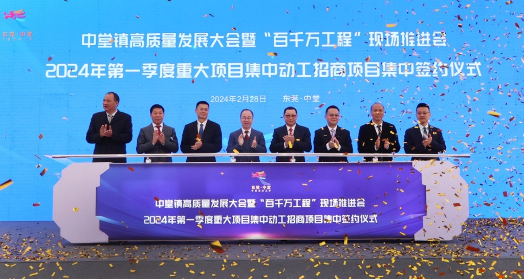 紫荊雜誌(記者彭彥)2月29日東莞報道:28日,東莞市中堂鎮舉行“打造水鄉製造強鎮 建設美麗善治新中堂”中堂鎮高品質發展大會 暨“百千萬工程”現場推進會 2024年第一季度重大項目集中動工招商項目集中簽約儀式。