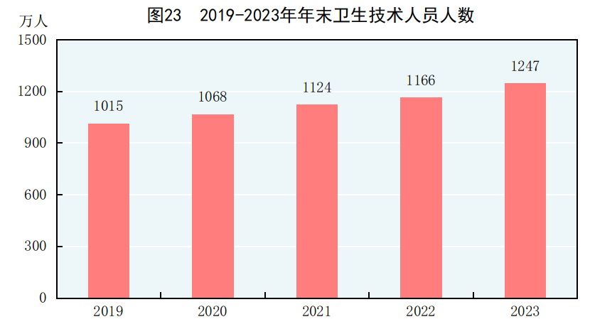 年末全國共有醫療衛生機構107.1萬個,其中醫院3.9萬個,在醫院中有公立醫院1.2萬個,民營醫院2.7萬個;基層醫療衛生機構101.6萬個,其中鄉鎮衛生院3.4萬個,社區衛生服務中心(站)3.7萬個,門診部(所)36.2萬個,村衛生室58.3萬個;專業公共衛生機構1.2萬個,其中疾病預防控制中心3426個,衛生監督所(中心)2791個。衛生技術人員1247萬人,其中執業醫師和執業助理醫師478萬人,註冊護士563萬人。醫療衛生機構床位1020萬張,其中醫院800萬張,鄉鎮衛生院151萬張。全年總診療人次[75]95.6億人次,出院人次[76]3.0億人次。