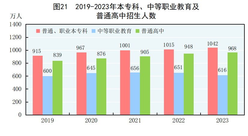 全年研究生教育招生130.2萬人,在學研究生388.3萬人,畢業生101.5萬人。普通、職業本專科[70]招生1042.2萬人,在校生3775.0萬人,畢業生1047.0萬人。中等職業教育[71]招生616.5萬人,在校生1737.9萬人,畢業生537.1萬人。普通高中招生967.8萬人,在校生2803.6萬人,畢業生860.4萬人。初中招生1754.6萬人,在校生5243.7萬人,畢業生1623.6萬人。普通小學招生1877.9萬人,在校生10836.0萬人,畢業生1763.5萬人。特殊教育招生15.5萬人,在校生91.2萬人,畢業生17.3萬人。學前教育在園幼兒4093.0萬人。九年義務教育鞏固率為95.7%,高中階段毛入學率為91.8%。