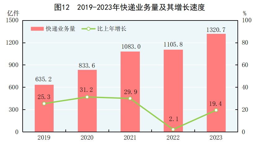 [29]郵政行業寄遞業務總量是指企業從事各類郵政普遍服務業務、快遞業務的總數量。