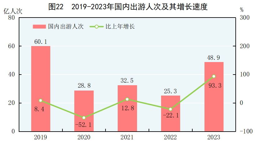 全年國內出遊48.9億人次,比上年增長93.3%。其中,城鎮居民國內出遊37.6億人次,增長94.9%;農村居民國內出遊11.3億人次,增長88.5%。國內遊客出遊總花費49133億元,增長140.3%。其中,城鎮居民出遊花費41781億元,增長147.5%;農村居民出遊花費7353億元,增長106.4%。入境遊客8203萬人次,其中外國人1378萬人次,香港、澳門和台灣同胞6824萬人次。入境遊客總花費530億美元。國內居民出境10096萬人次,其中因私出境9684萬人次,赴港澳台出境7704萬人次。