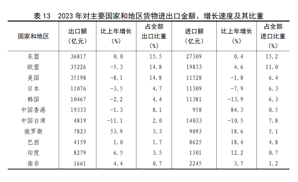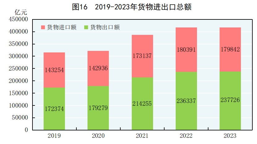 全年貨物進出口總額417568億元,比上年增長0.2%。其中,出口237726億元,增長0.6%;進口179842億元,下降0.3%。貨物進出口順差57883億元,比上年增加1938億元。對共建“一帶一路”[46]國家進出口額194719億元,比上年增長2.8%。其中,出口107314億元,增長6.9%;進口87405億元,下降1.9%。對《區域全面經濟夥伴關系協定》(RCEP)其他成員國[47]進出口額125967億元,比上年下降1.6%。民營企業進出口額223601億元,比上年增長6.3%,佔進出口總額比重為53.5%。