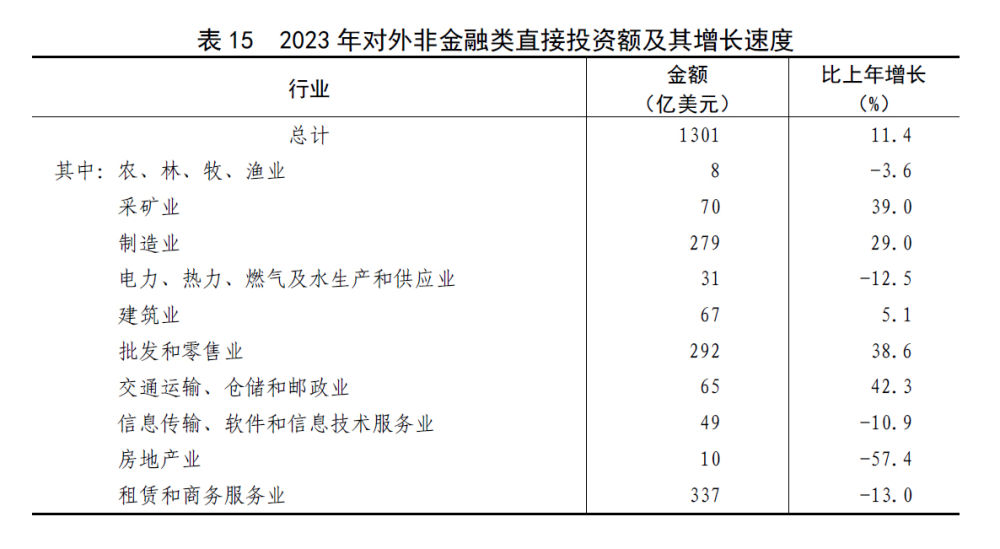 全年對外非金融類直接投資額9170億元,比上年增長16.7%,折1301億美元,增長11.4%。其中,對共建“一帶一路”國家非金融類直接投資額2241億元,增長28.4%,折318億美元,增長22.6%。