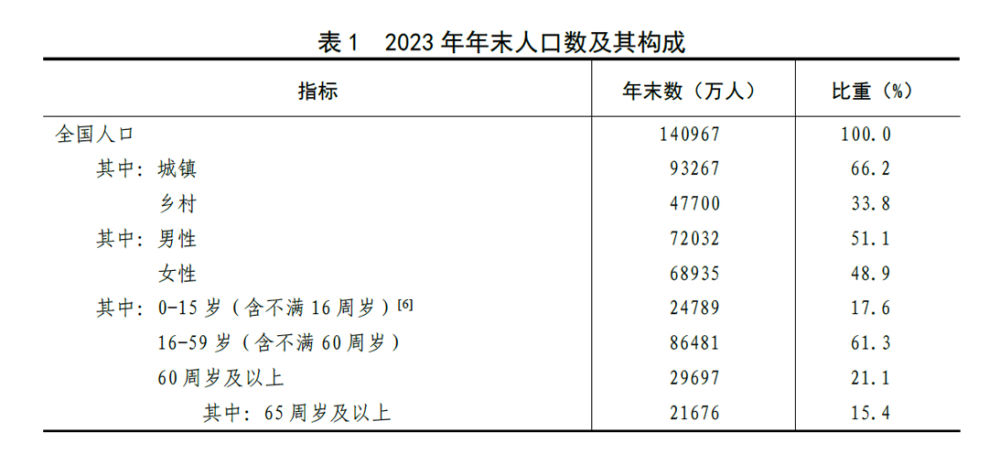 [6]2023年年末,0-14歲(含不滿15週歲)人口為23063萬人,15-59歲(含不滿60週歲)人口為88207萬人。