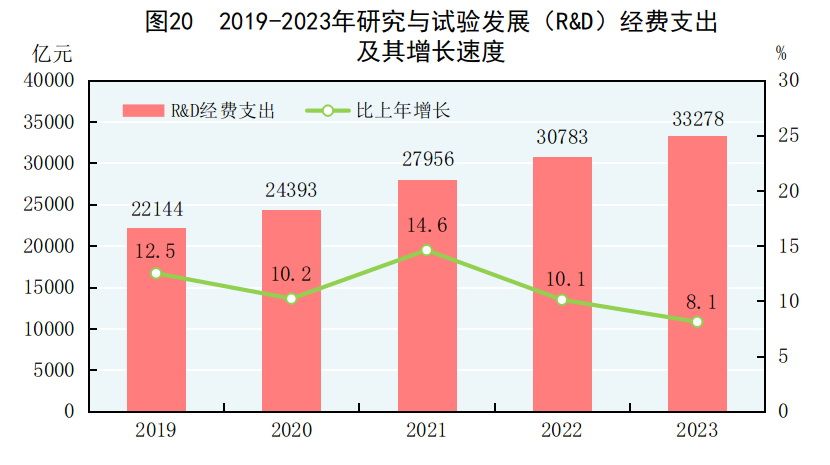 全年研究與試驗發展(R&D)經費支出33278億元,比上年增長8.1%,與國內生產總值之比為2.64%,其中基礎研究經費2212億元,比上年增長9.3%,佔R&D經費支出比重為6.65%。國家自然科學基金共資助5.25萬個項目。截至年末,納入新序列管理的國家工程研究中心207個,國家企業技術中心1798家。國家科技成果轉化引導基金累計設立36只子基金,資金總規模624億元。國家級科技企業孵化器[64]1606家,國家備案眾創空間[65]2376家。全年授予發明專利權92.1萬件,比上年增長15.3%。PCT專利申請受理量[66]7.4萬件。截至年末,有效發明專利499.1萬件,比上年末增長18.5%。每萬人口高價值發明專利擁有量[67]11.8件。全年商標注冊438.3萬件,比上年下降29.0%。全年共簽訂技術合同95萬項,技術合同成交金額61476億元,比上年增長28.6%。我國公民具備科學素質[68]的比例達到14.14%。
