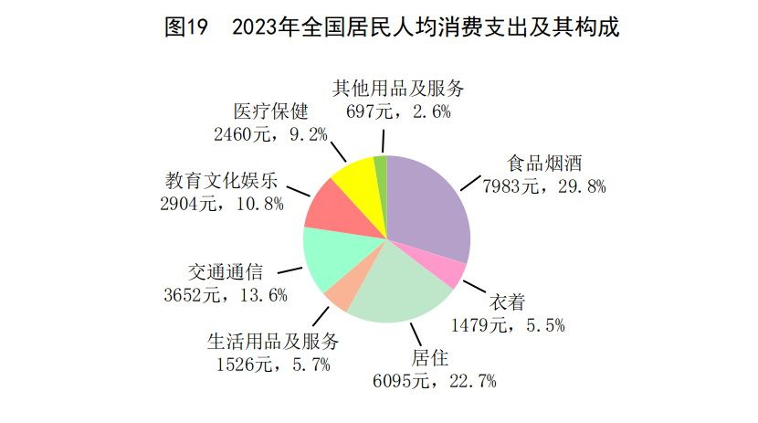 全年全國居民人均消費支出26796元,比上年增長9.2%,扣除價格因素,實際增長9.0%。其中,人均服務性消費支出[59]12114元,比上年增長14.4%,佔居民人均消費支出比重為45.2%。按常住地分,城鎮居民人均消費支出32994元,增長8.6%,扣除價格因素,實際增長8.3%;農村居民人均消費支出18175元,增長9.3%,扣除價格因素,實際增長9.2%。全國居民恩格爾系數為29.8%,其中城鎮為28.8%,農村為32.4%。