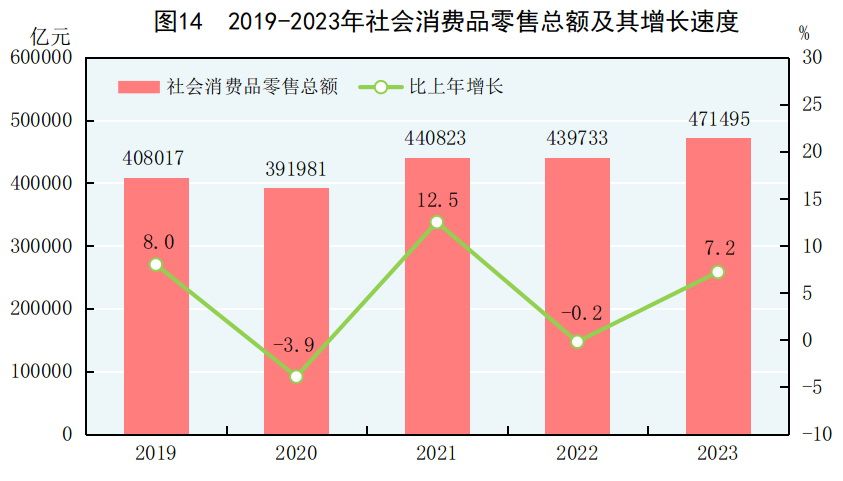 全年社會消費品零售總額471495億元,比上年增長7.2%。按經營地分,城鎮消費品零售額407490億元,增長7.1%;鄉村消費品零售額64005億元,增長8.0%。按消費類型分,商品零售額418605億元,增長5.8%;餐飲收入52890億元,增長20.4%。服務零售額[36]比上年增長20.0%。