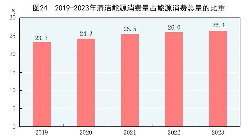 綠色低碳轉型深入推進。全年全國萬元國內生產總值二氧化碳排放[21]與上年持平。水電、核電、風電、太陽能發電等清潔能源發電量31906億千瓦時,比上年增長7.8%。在監測的339個地級及以上城市中,空氣質量達標的城市佔59.9%,未達標的城市佔40.1%。3641個國家地表水考核斷面中,水質優良(Ⅰ~Ⅲ類)斷面比例為89.4%,Ⅳ類斷面比例為8.4%,Ⅴ類斷面比例為1.5%,劣Ⅴ類斷面比例為0.7%。