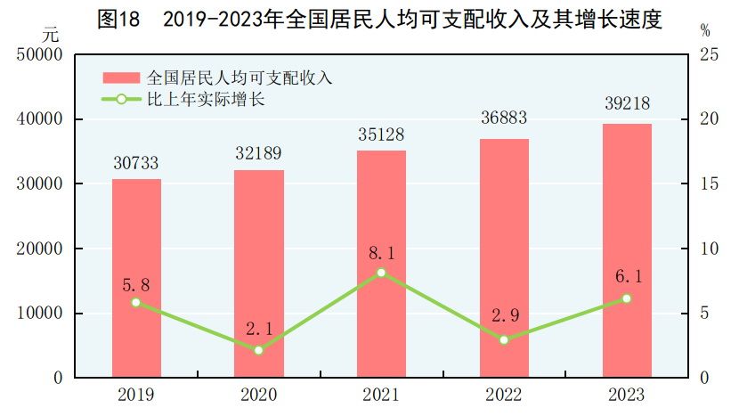 全年全國居民人均可支配收入39218元,比上年增長6.3%,扣除價格因素,實際增長6.1%。全國居民人均可支配收入中位數[56]33036元,增長5.3%。按常住地分,城鎮居民人均可支配收入51821元,比上年增長5.1%,扣除價格因素,實際增長4.8%。城鎮居民人均可支配收入中位數47122元,增長4.4%。農村居民人均可支配收入21691元,比上年增長7.7%,扣除價格因素,實際增長7.6%。農村居民人均可支配收入中位數18748元,增長5.7%。城鄉居民人均可支配收入比值為2.39,比上年縮小0.06。按全國居民五等份收入分組[57],低收入組人均可支配收入9215元,中間偏下收入組人均可支配收入20442元,中間收入組人均可支配收入32195元,中間偏上收入組人均可支配收入50220元,高收入組人均可支配收入95055元。全國農民工人均月收入4780元,比上年增長3.6%。脫貧縣[58]農村居民人均可支配收入16396元,比上年增長8.5%,扣除價格因素,實際增長8.4%。