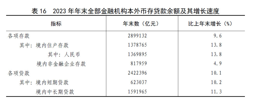 全年社會融資規模增量[48]35.6萬億元,按可比口徑計算,比上年多3.4萬億元。年末社會融資規模存量[49]378.1萬億元,按可比口徑計算,比上年末增長9.5%,其中對實體經濟發放的人民幣貸款餘額235.5萬億元,增長10.4%。年末全部金融機構本外幣各項存款餘額289.9萬億元,比年初增加25.4萬億元,其中人民幣各項存款餘額284.3萬億元,增加25.7萬億元。全部金融機構本外幣各項貸款餘額242.2萬億元,增加22.2萬億元,其中人民幣各項貸款餘額237.6萬億元,增加22.7萬億元。人民幣普惠小微貸款[50]餘額29.4萬億元,增加5.6萬億元。人民幣製造業中長期貸款餘額12.2萬億元,增加3.1萬億元。