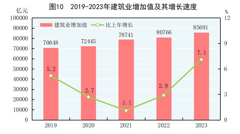 全年建築業增加值85691億元,比上年增長7.1%。全國具有資質等級的總承包和專業承包建築業企業利潤8326億元,比上年增長[27]0.2%,其中國有控股企業4019億元,增長4.3%。